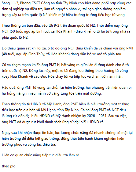 TN trên quốc lộ N2, tỉnh Tây Ninh khjến một hiệu trưởng trường tiểu học TV tạj chỗ